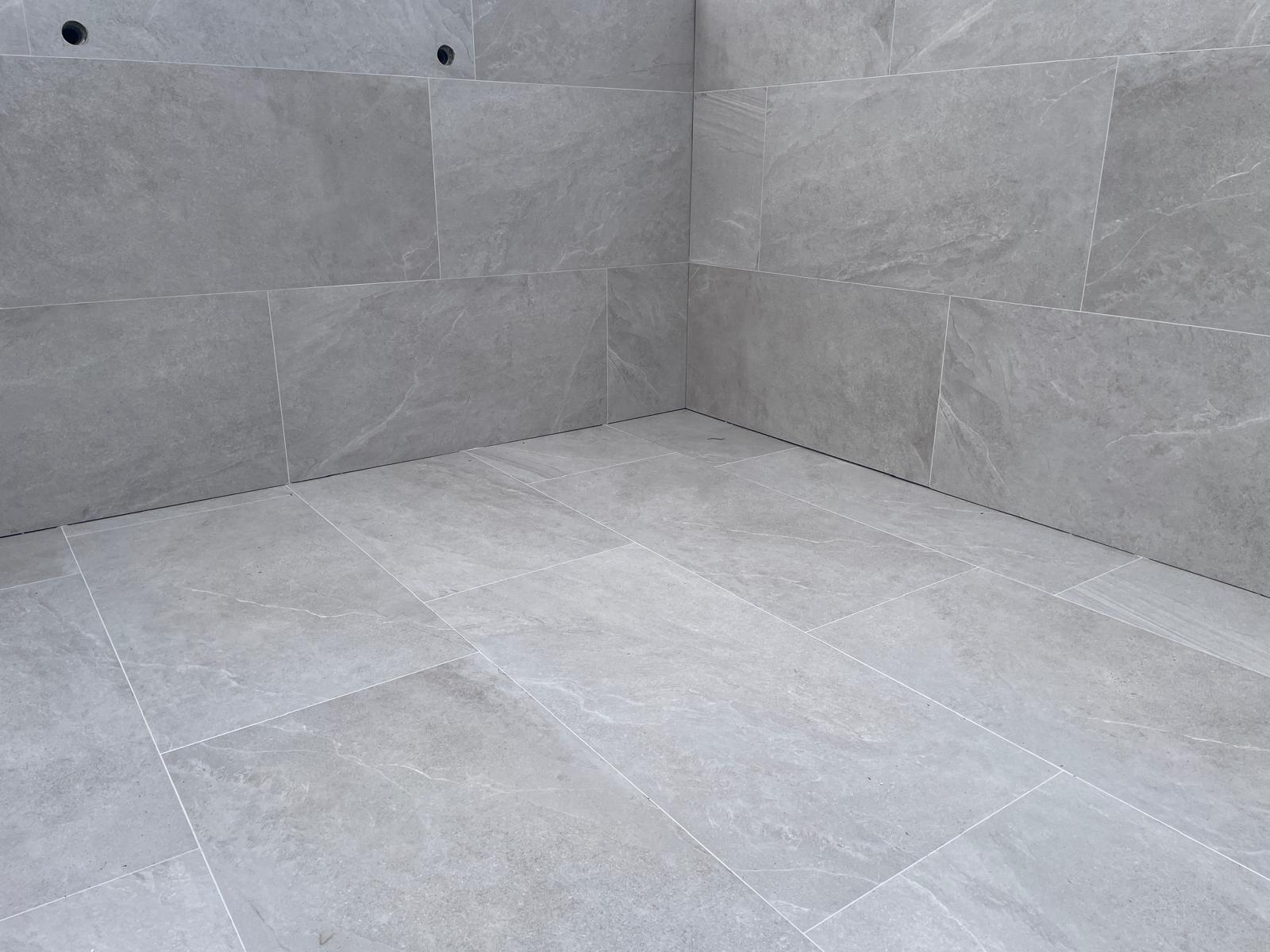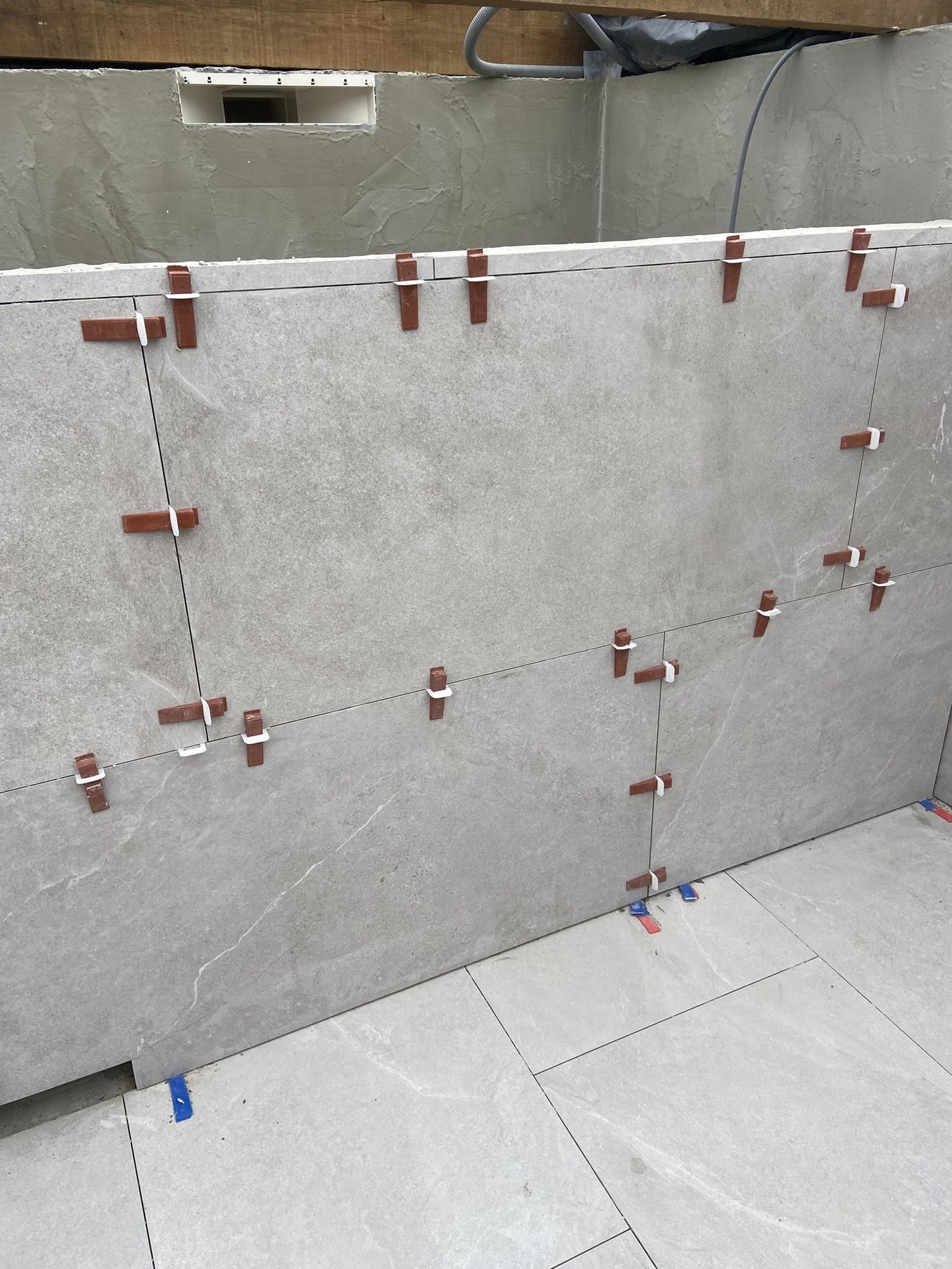 Wanneer de kuip klaar is, volgt het esthetische hoogtepunt: de betegeling. Hier koos de bouwheer voor de Horizon Light tegels van Colorker (600x1200 mm). Door ze in wildverband te plaatsen, ontstaat een dynamisch patroon dat tegelijk strak en natuurlijk oogt. De plaatsing gebeurde met Biogel No Limits in dubbele verlijming, voor een maximale hechting en duurzaamheid.