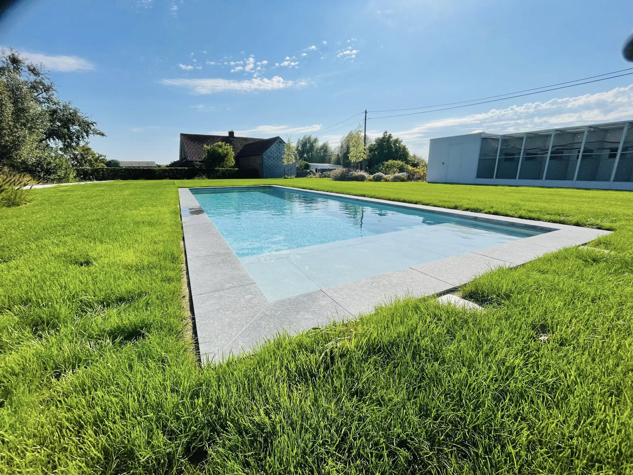 Het eindbeeld spreekt voor zich: een zwembad van 12 x 4 meter, waarin de grote lichte tegels de lengte van het bad benadrukken en voor een bijzonder ruimtelijk effect zorgen. De blauwsteen boordsteen kadert het geheel op elegante wijze en versterkt de moderne look.